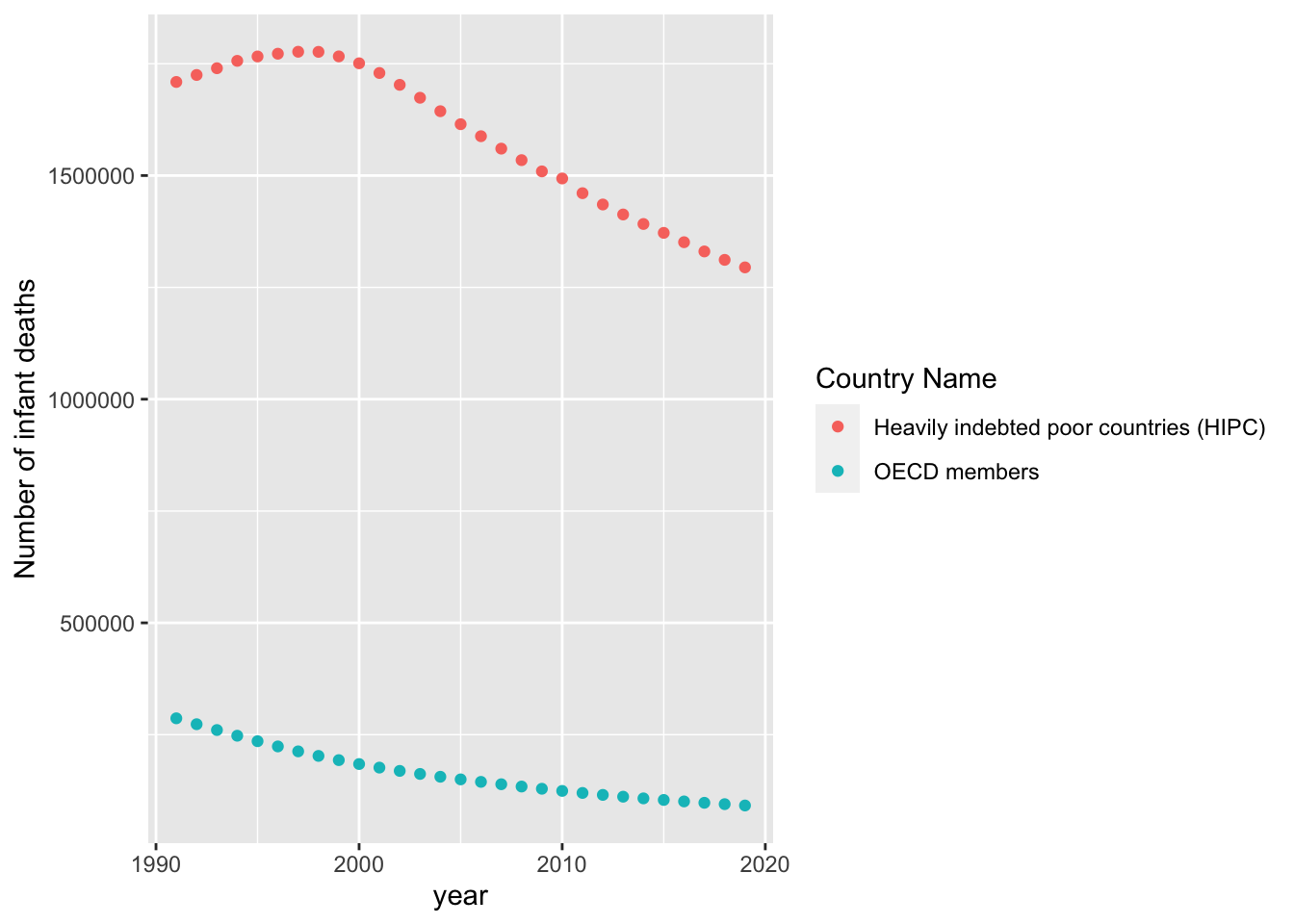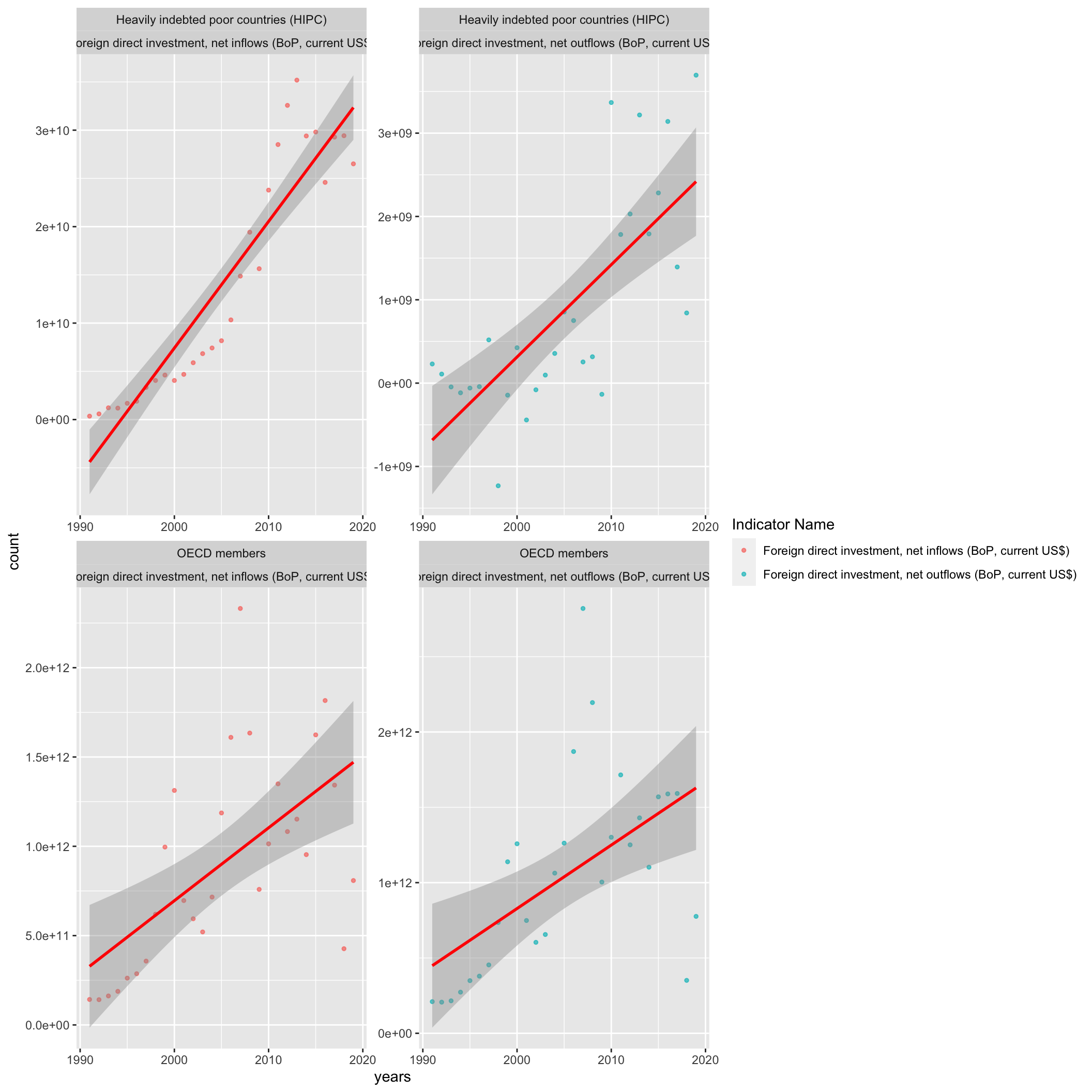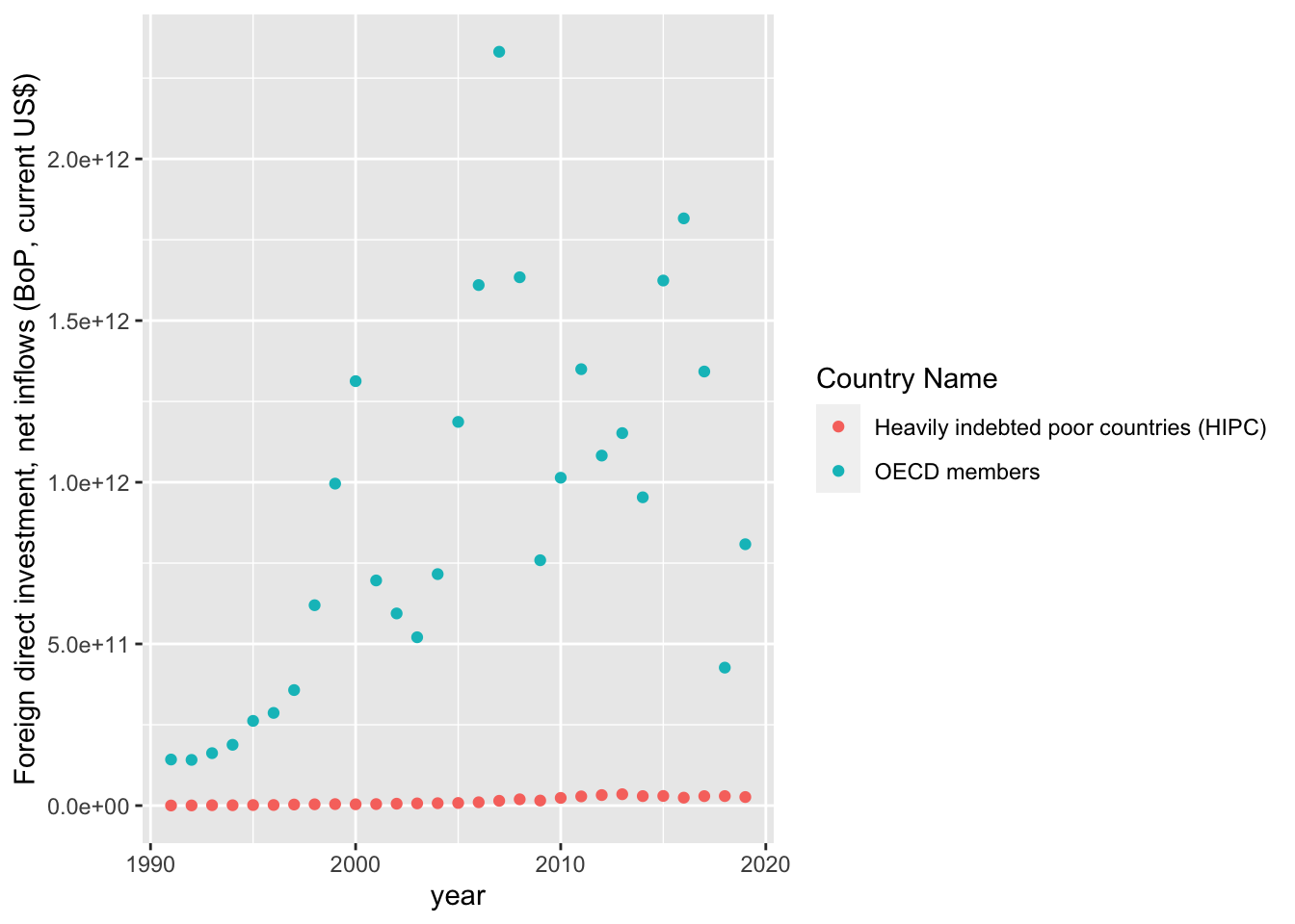 As we can see in the trends there is a massive disparity between HIPC and OECD countries. This difference implies that we should proceed with two seperate models for each group. Additionally, we will have to account for non-linear patterns present in the trends above. In the meantime, let us continue our data exploration with two scatterplots - one for each country group.