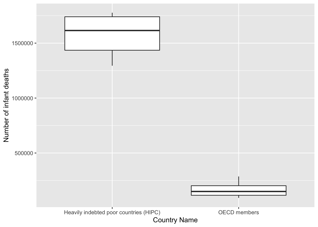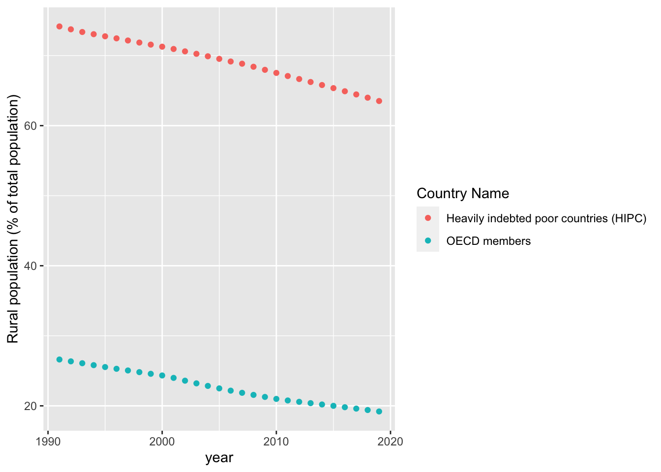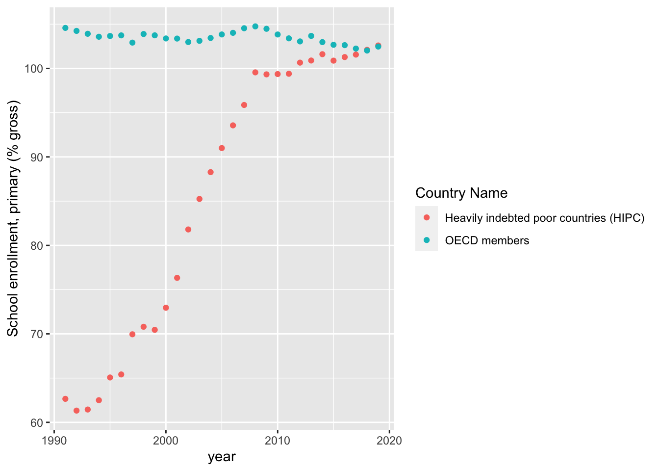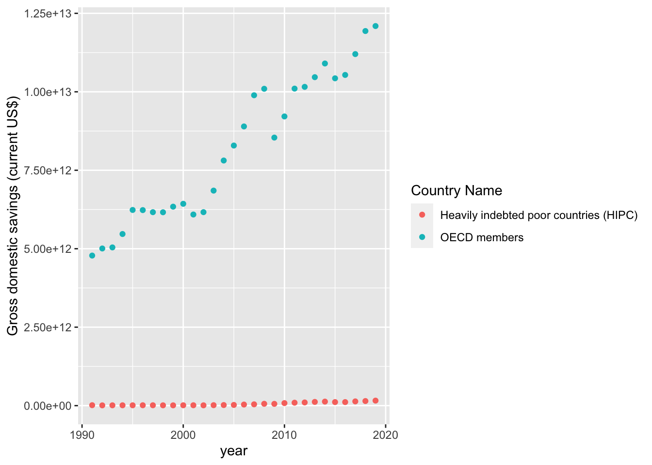 As we can see in the trends there is a massive disparity between HIPC and OECD countries. This difference implies that we should proceed with two seperate models for each group. Additionally, we will have to account for non-linear patterns present in the trends above. In the meantime, let us continue our data exploration with two scatterplots - one for each country group.