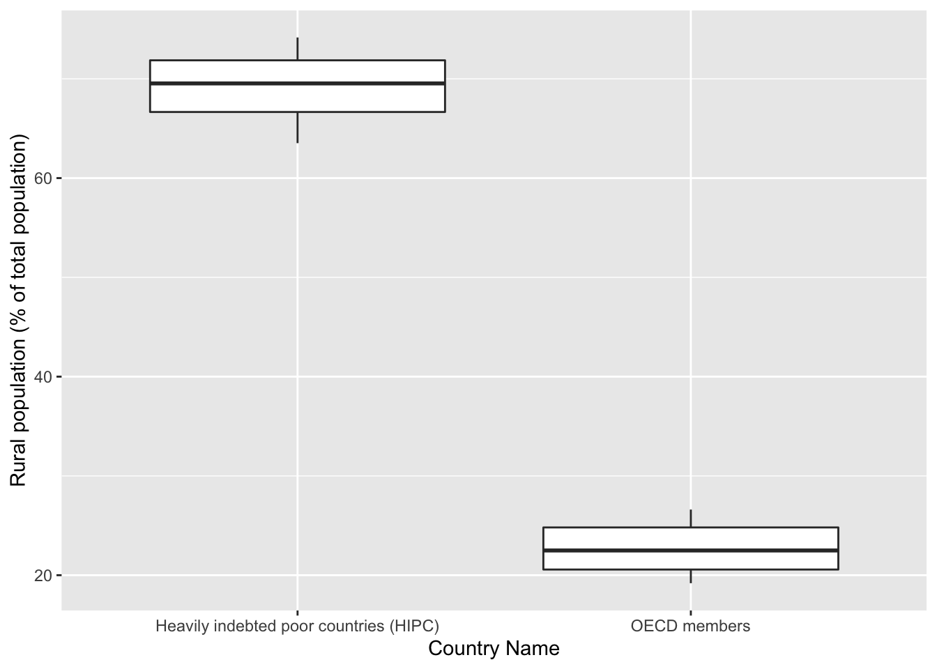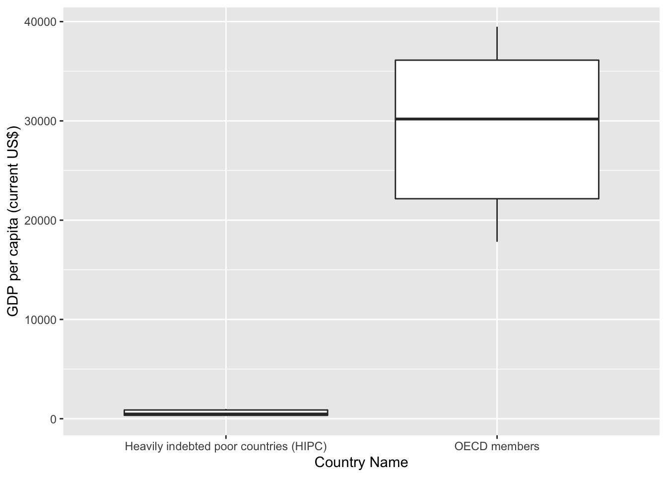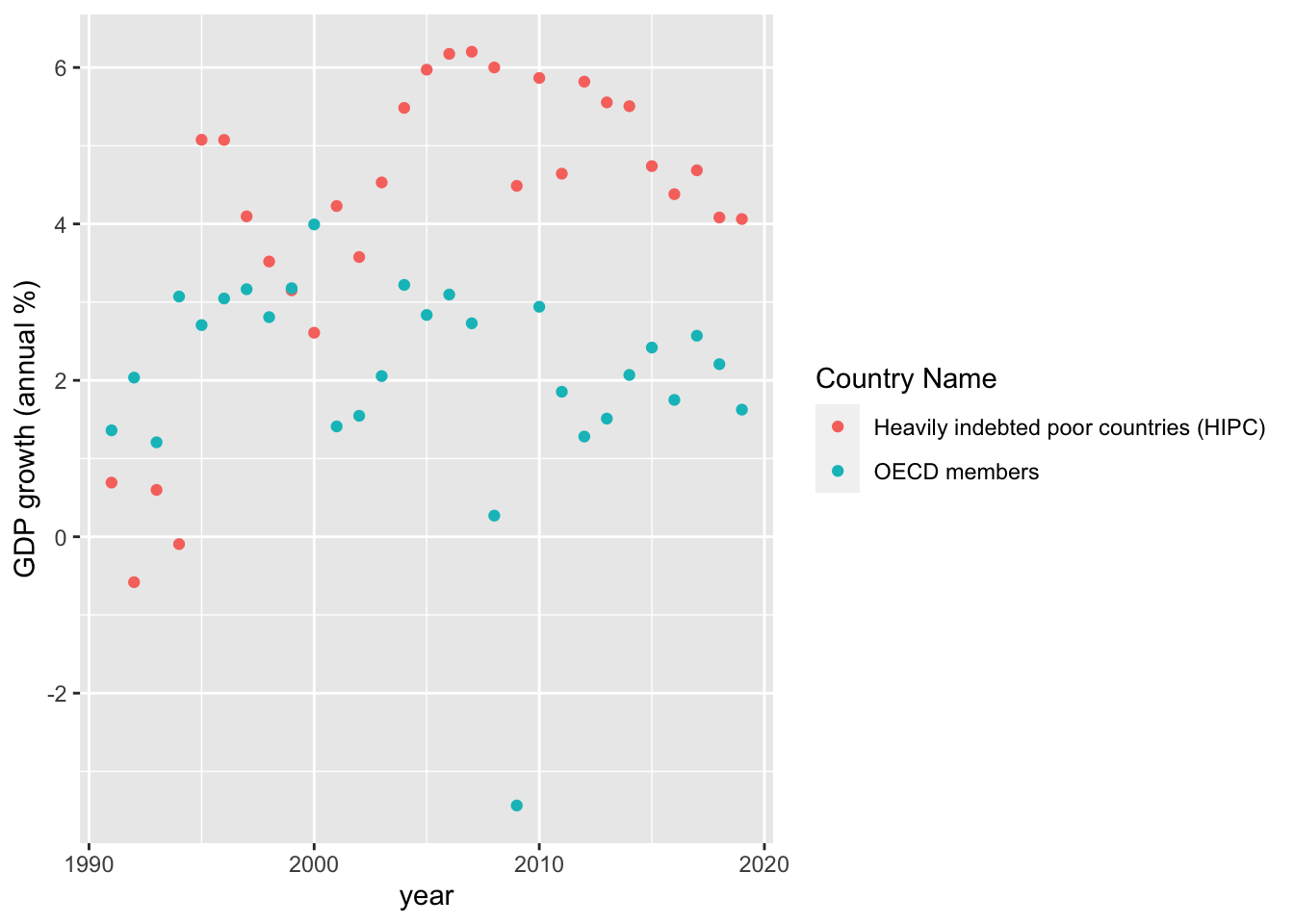 However, we don’t want to just understand what factors may play a role in GDP growth for a country. We want to further understand the differences between developing (HIPC) and developed (OECD) countries. For this, the WDI dataset provides aggregate country information based on these criterion: the Heavily Indebted PoorCountry (HIDPC) aggregate, and the Organisation for Economic Co-operation and Development (OECD) aggregate.