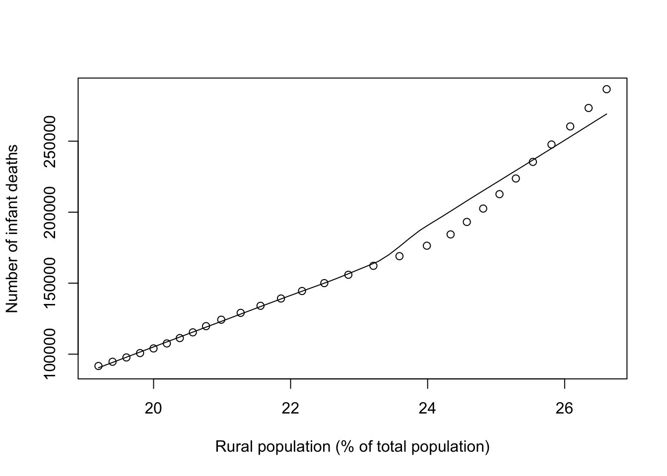 ## lm(formula = `Number of infant deaths` ~ `Rural population (% of total population)`,