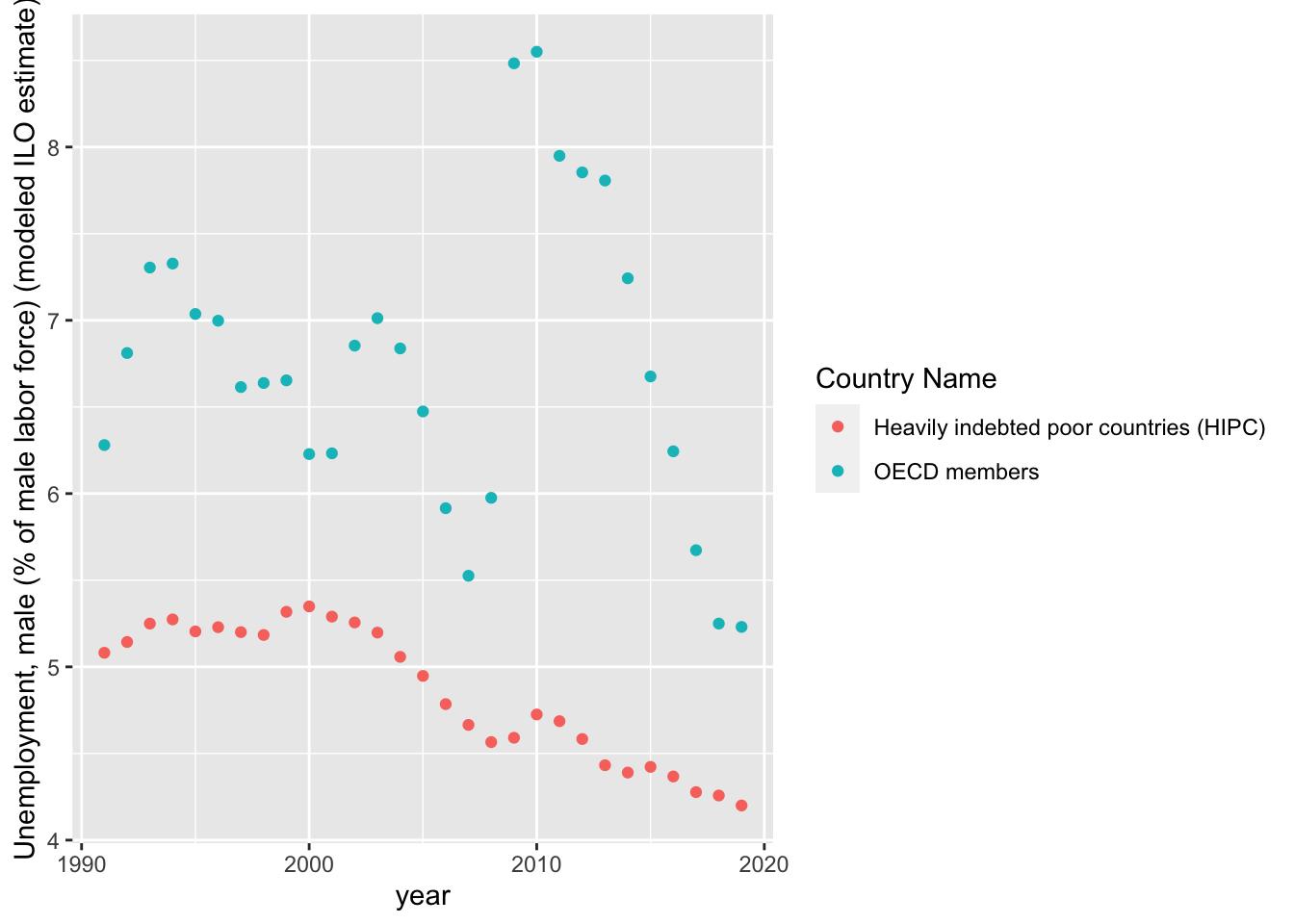 y=`Unemployment, male (% of male labor force) (modeled ILO estimate)`,