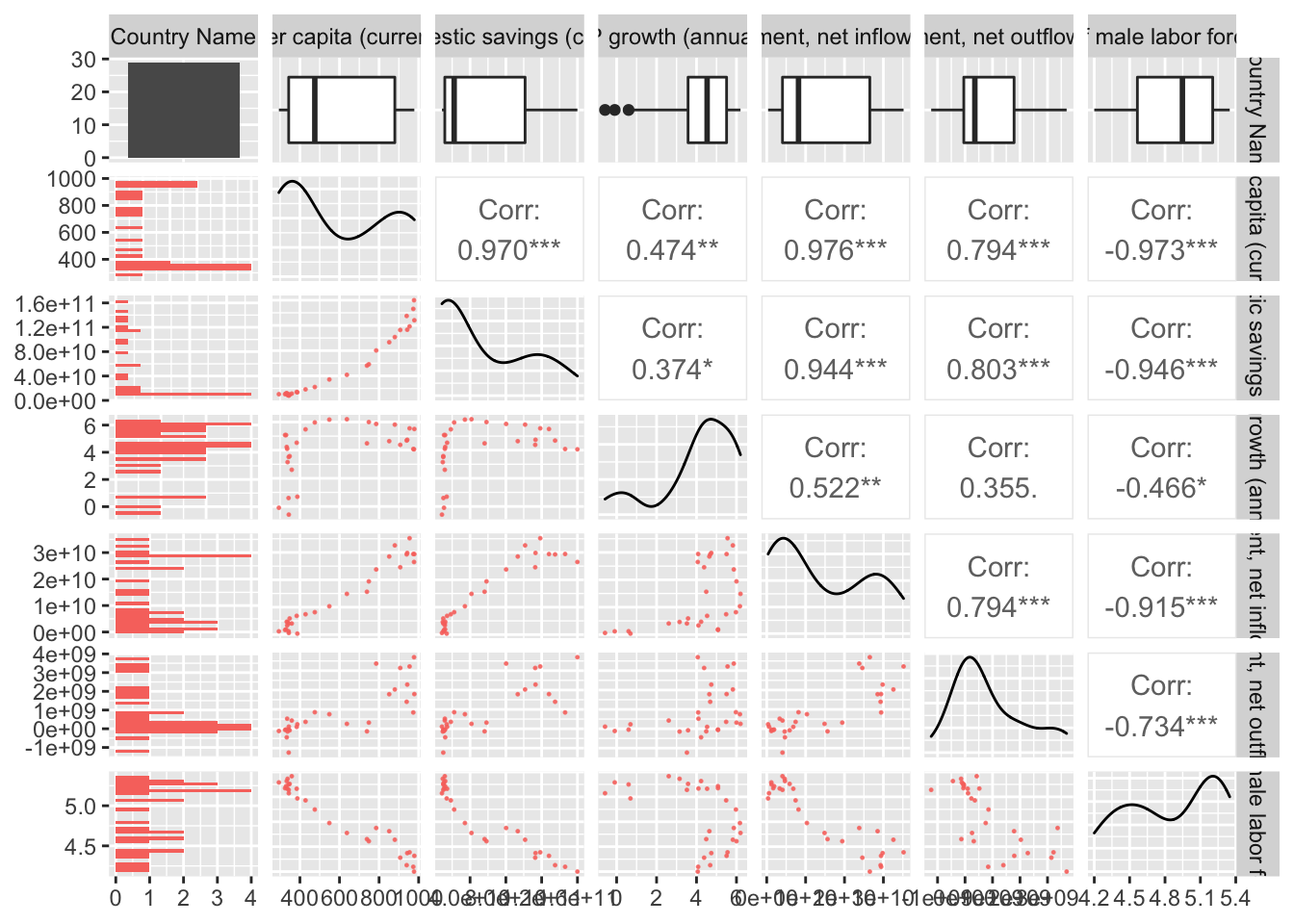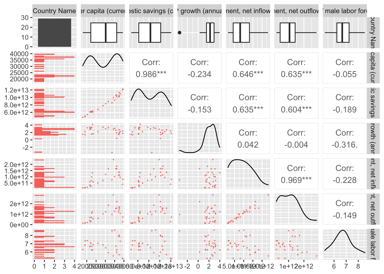 As observed in the scatterplots we find that our covariates have a high correlation with GDP per capita which is promising as we look to begin modeling on this dataset. However, we also notice there is foreign domestic inflow and outflow are very highly correlated. This introduces an issue of collinearity if both are included in a model. To avoid this we remove the variable with a lower correlation with GDP per capita. Additionally, gross domestic savings has a suspiciously high correlation with GDP per capita which makes sense as it is defined as a percentage of GDP. This indicates that our model would be using information is should not have directly available when GDP per capita is our predicted value. Therefore, it should be removed for any subsequent model when predicting GDP per capita.