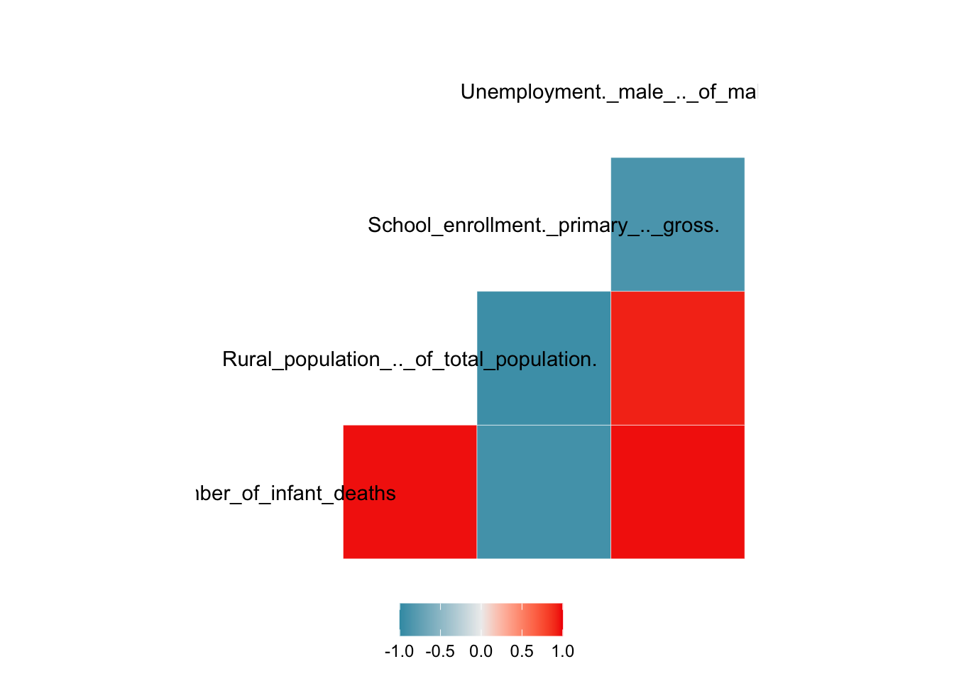 This analysis started off as an exploration of microeconomic factors that have links to the development of an economy (with unemployment being the key measure of development.) However, our analysis has transformed our point of view on discussion of development. In developing economies, our data has uncovered the codependant relationship of unemployment and infant moralities, a grim reality that many infants in developing economies die from inadequate care and provision. Even in developed settings, a large rural population which is not exposed to the advanced level of healthcare that the environment provides will cause higher infant deaths. Our goals shifted from a discussion on unemployment as a grassroot level to the uneasing reality of inadequate child protection.