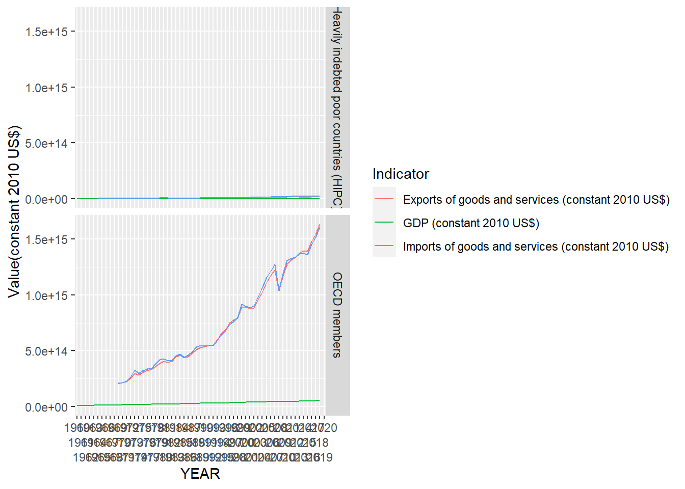 GDP_CONSTANT_TRADE <- GDP_TRADE%>%filter(Indicator == "GDP (constant 2010 US$)"| Indicator == "Exports of goods and services (constant 2010 US$)"| Indicator == "Imports of goods and services (constant 2010 US$)")