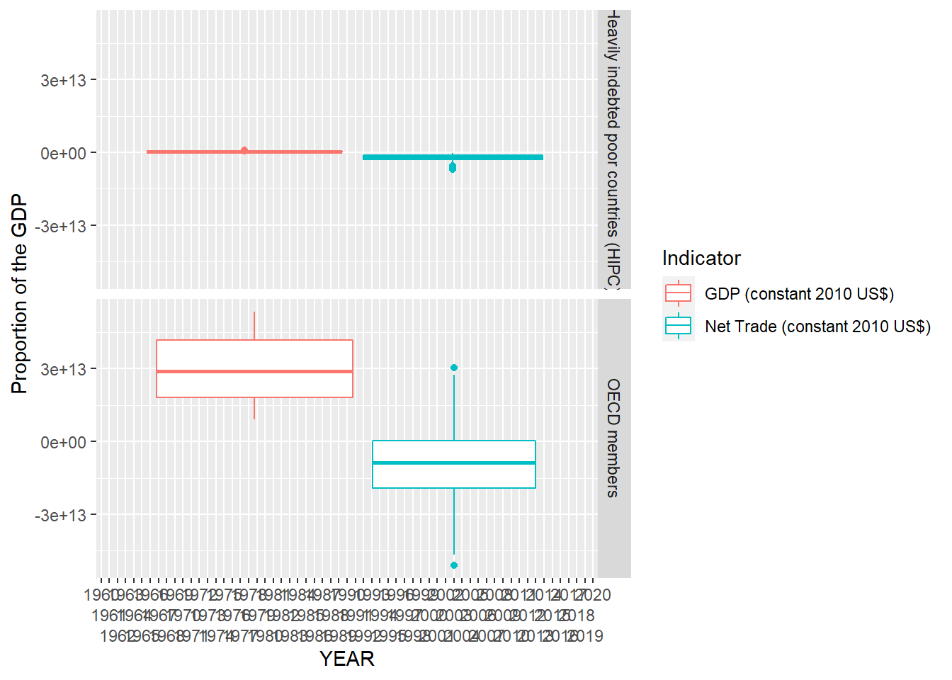 GDP_PROP_TRADE_NET %>% ggplot() + geom_boxplot(aes(x = year, y = `Value`, color = `Indicator`, group = Indicator))+ facet_grid(`Country Name` ~.) + xlab("YEAR") + ylab("Proportion of the GDP")+scale_x_discrete(guide = guide_axis(n.dodge=3))